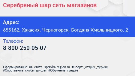 Серебряный шар, сеть магазинов по адресу 655162, Хакасия, Черногорск, Богдана Хмельницкого, 2 в дальнейшем Организация, размещена в следующих категориях: