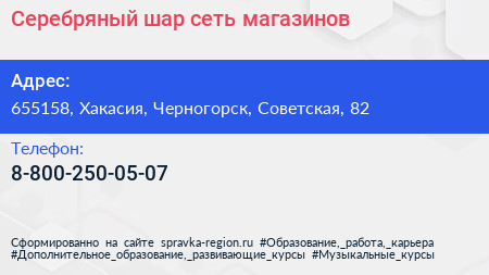 Серебряный шар, сеть магазинов по адресу 655158, Хакасия, Черногорск, Советская, 82 в дальнейшем Организация, размещена в следующих категориях: