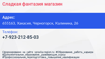 Сладкая фантазия, магазин по адресу 655163, Хакасия, Черногорск, Калинина, 26 в дальнейшем Организация, размещена в следующих категориях: