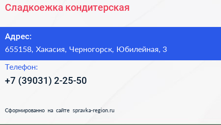 Сладкоежка, кондитерская по адресу 655158, Хакасия, Черногорск, Юбилейная, 3 в дальнейшем Организация, размещена в следующих категориях: