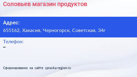 Соловьев, магазин продуктов по адресу 655162, Хакасия, Черногорск, Советская, 34г в дальнейшем Организация, размещена в следующих категориях: