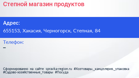 Степной, магазин продуктов по адресу 655153, Хакасия, Черногорск, Степная, 84 в дальнейшем Организация, размещена в следующих категориях:
