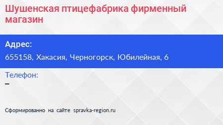 Шушенская птицефабрика, фирменный магазин по адресу 655158, Хакасия, Черногорск, Юбилейная, 6 в дальнейшем Организация, размещена в следующих категориях: