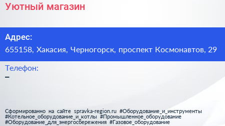 Уютный, магазин по адресу 655158, Хакасия, Черногорск, проспект Космонавтов, 29 в дальнейшем Организация, размещена в следующих категориях: