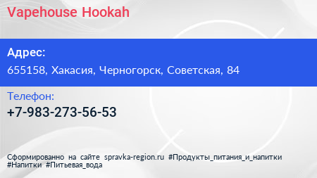 Vapehouse & Hookah по адресу 655158, Хакасия, Черногорск, Советская, 84 в дальнейшем Организация, размещена в следующих категориях: