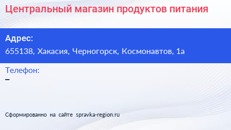 Центральный, магазин продуктов питания по адресу 655138, Хакасия, Черногорск, Космонавтов, 1а в дальнейшем Организация, размещена в следующих категориях: