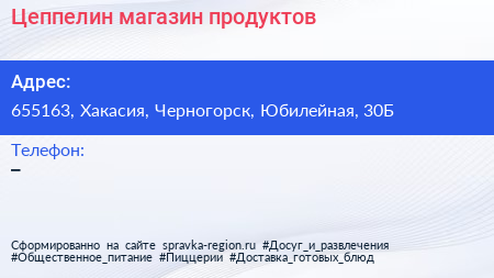 Цеппелин, магазин продуктов по адресу 655163, Хакасия, Черногорск, Юбилейная, 30Б в дальнейшем Организация, размещена в следующих категориях: