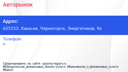 Авторынок по адресу 655153, Хакасия, Черногорск, Энергетиков, 9а в дальнейшем Организация, размещена в следующих категориях: