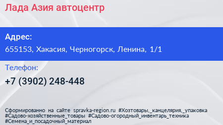 Лада-Азия, автоцентр по адресу 655153, Хакасия, Черногорск, Ленина, 1/1 в дальнейшем Организация, размещена в следующих категориях:
