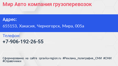 Мир Авто, компания грузоперевозок по адресу 655153, Хакасия, Черногорск, Мира, 005а в дальнейшем Организация, размещена в следующих категориях: