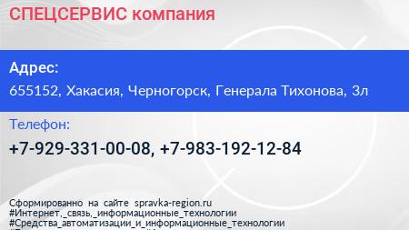 СПЕЦСЕРВИС, компания по адресу 655152, Хакасия, Черногорск, Генерала Тихонова, 3л в дальнейшем Организация, размещена в следующих категориях: