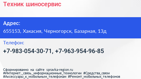 Техник, шиносервис по адресу 655153, Хакасия, Черногорск, Базарная, 13д в дальнейшем Организация, размещена в следующих категориях:
