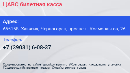 ЦАВС, билетная касса по адресу 655158, Хакасия, Черногорск, проспект Космонавтов, 26 в дальнейшем Организация, размещена в следующих категориях: