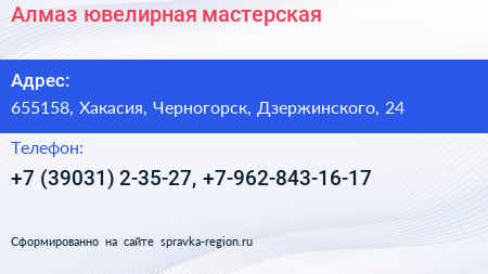 Алмаз, ювелирная мастерская по адресу 655158, Хакасия, Черногорск, Дзержинского, 24 в дальнейшем Организация, размещена в следующих категориях: