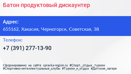 Батон, продуктовый дискаунтер по адресу 655162, Хакасия, Черногорск, Советская, 38 в дальнейшем Организация, размещена в следующих категориях: