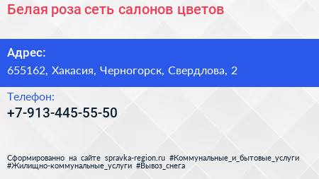 Белая роза, сеть салонов цветов по адресу 655162, Хакасия, Черногорск, Свердлова, 2 в дальнейшем Организация, размещена в следующих категориях: