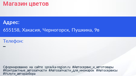 Магазин цветов по адресу 655158, Хакасия, Черногорск, Пушкина, 9в в дальнейшем Организация, размещена в следующих категориях: