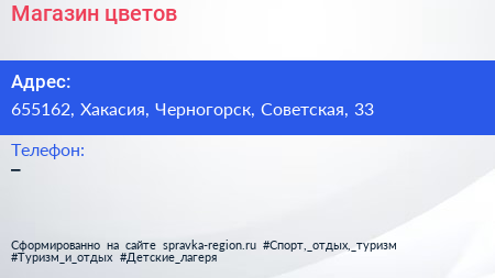 Магазин цветов по адресу 655162, Хакасия, Черногорск, Советская, 33 в дальнейшем Организация, размещена в следующих категориях:
