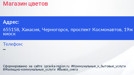 Магазин цветов по адресу 655158, Хакасия, Черногорск, проспект Космонавтов, 19ж киоск в дальнейшем Организация, размещена в следующих категориях:
