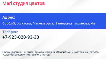 Mari, студия цветов по адресу 655163, Хакасия, Черногорск, Генерала Тихонова, 4в в дальнейшем Организация, размещена в следующих категориях: