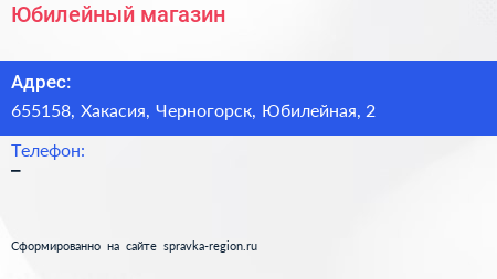 Юбилейный, магазин по адресу 655158, Хакасия, Черногорск, Юбилейная, 2 в дальнейшем Организация, размещена в следующих категориях: