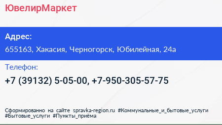 ЮвелирМаркет по адресу 655163, Хакасия, Черногорск, Юбилейная, 24а в дальнейшем Организация, размещена в следующих категориях:
