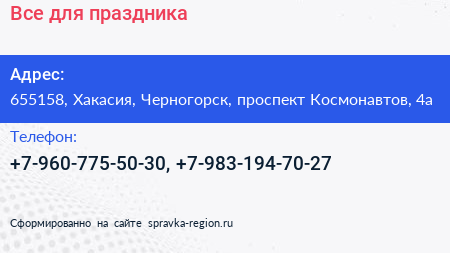 Все для праздника по адресу 655158, Хакасия, Черногорск, проспект Космонавтов, 4а в дальнейшем Организация, размещена в следующих категориях: