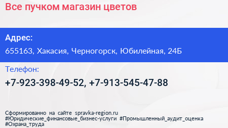 Все пучком!, магазин цветов по адресу 655163, Хакасия, Черногорск, Юбилейная, 24Б в дальнейшем Организация, размещена в следующих категориях: