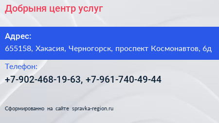 Добрыня, центр услуг по адресу 655158, Хакасия, Черногорск, проспект Космонавтов, 6д в дальнейшем Организация, размещена в следующих категориях: