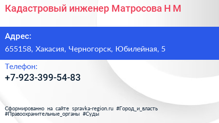 Кадастровый инженер Матросова Н.М. по адресу 655158, Хакасия, Черногорск, Юбилейная, 5 в дальнейшем Организация, размещена в следующих категориях: