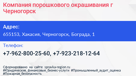 Компания порошкового окрашивания, г. Черногорск по адресу 655153, Хакасия, Черногорск, Бограда, 1 в дальнейшем Организация, размещена в следующих категориях: