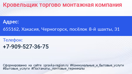 Кровельщик, торгово-монтажная компания по адресу 655162, Хакасия, Черногорск, посёлок 8-й шахты, 31 в дальнейшем Организация, размещена в следующих категориях: