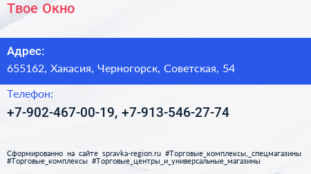 Твое Окно по адресу 655162, Хакасия, Черногорск, Советская, 54 в дальнейшем Организация, размещена в следующих категориях: