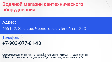 Водяной, магазин сантехнического оборудования по адресу 655152, Хакасия, Черногорск, Линейная, 253 в дальнейшем Организация, размещена в следующих категориях: