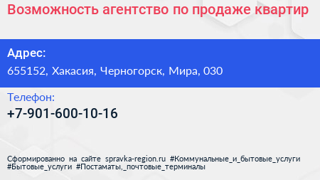 Возможность, агентство по продаже квартир по адресу 655152, Хакасия, Черногорск, Мира, 030 в дальнейшем Организация, размещена в следующих категориях:
