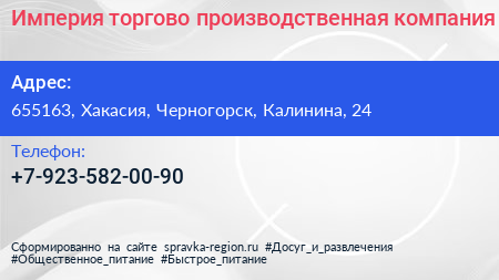 Империя, торгово-производственная компания по адресу 655163, Хакасия, Черногорск, Калинина, 24 в дальнейшем Организация, размещена в следующих категориях: