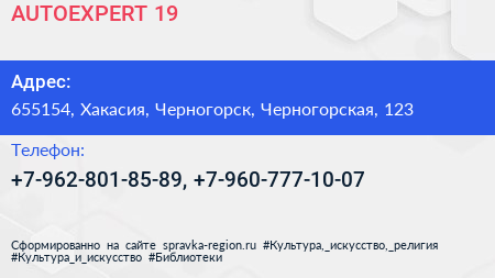 AUTOEXPERT 19 по адресу 655154, Хакасия, Черногорск, Черногорская, 123 в дальнейшем Организация, размещена в следующих категориях: