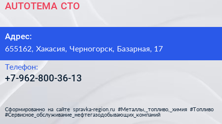 AUTOTEMA, СТО по адресу 655162, Хакасия, Черногорск, Базарная, 17 в дальнейшем Организация, размещена в следующих категориях: