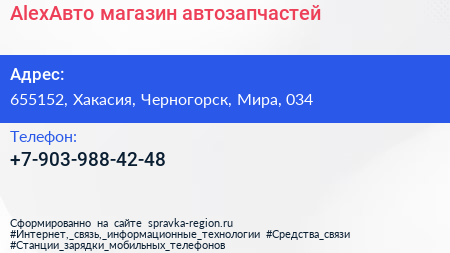 AlexАвто, магазин автозапчастей по адресу 655152, Хакасия, Черногорск, Мира, 034 в дальнейшем Организация, размещена в следующих категориях: