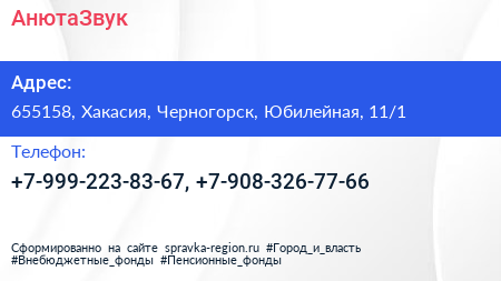 АнютаЗвук по адресу 655158, Хакасия, Черногорск, Юбилейная, 11/1 в дальнейшем Организация, размещена в следующих категориях: