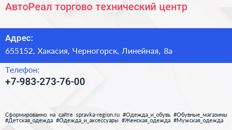 АвтоРеал, торгово-технический центр по адресу 655152, Хакасия, Черногорск, Линейная, 8а в дальнейшем Организация, размещена в следующих категориях: