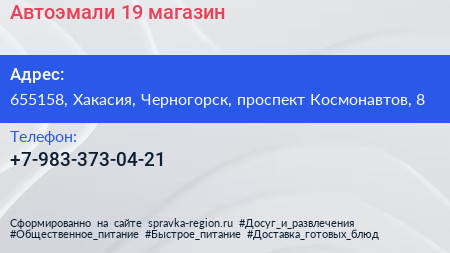 Автоэмали 19, магазин по адресу 655158, Хакасия, Черногорск, проспект Космонавтов, 8 в дальнейшем Организация, размещена в следующих категориях: