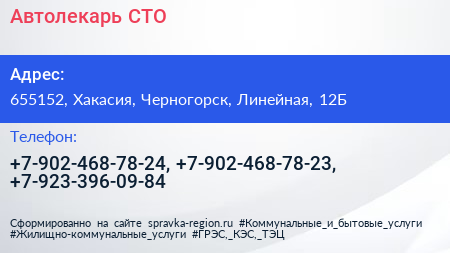 Автолекарь, СТО по адресу 655152, Хакасия, Черногорск, Линейная, 12Б в дальнейшем Организация, размещена в следующих категориях: