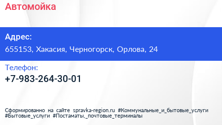 Автомойка по адресу 655153, Хакасия, Черногорск, Орлова, 24 в дальнейшем Организация, размещена в следующих категориях: