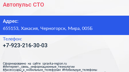 Автопульс, СТО по адресу 655153, Хакасия, Черногорск, Мира, 005Б в дальнейшем Организация, размещена в следующих категориях: