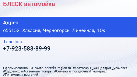 БЛЕСК, автомойка по адресу 655152, Хакасия, Черногорск, Линейная, 10к в дальнейшем Организация, размещена в следующих категориях: