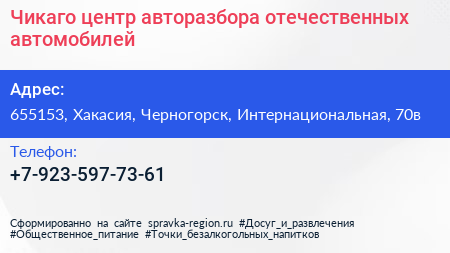 Чикаго, центр авторазбора отечественных автомобилей по адресу 655153, Хакасия, Черногорск, Интернациональная, 70в в дальнейшем Организация, размещена в следующих категориях: