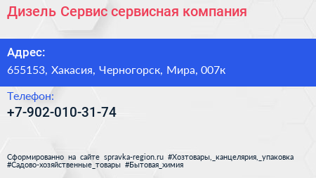 Дизель-Сервис, сервисная компания по адресу 655153, Хакасия, Черногорск, Мира, 007к в дальнейшем Организация, размещена в следующих категориях: