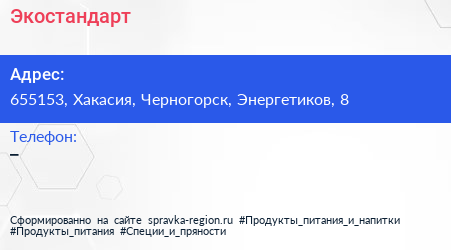 Экостандарт по адресу 655153, Хакасия, Черногорск, Энергетиков, 8 в дальнейшем Организация, размещена в следующих категориях: