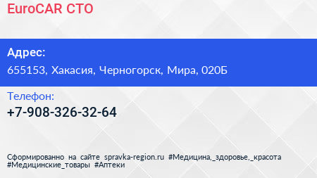 EuroCAR, СТО по адресу 655153, Хакасия, Черногорск, Мира, 020Б в дальнейшем Организация, размещена в следующих категориях: